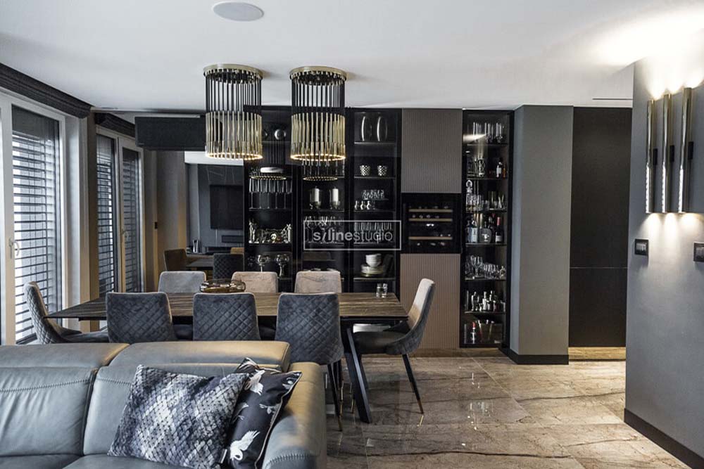 Wykonanie wnętrza zlecili właśnie nam. Od pierwszej rozmowy i analizy ich potrzeb wiedzieliśmy , że będzie to wyjątkowy projekt. Córka potrzebowała swojej przestrzeni, a Tatiana zawsze marzyła o sypialni z toaletką i miejscem gdzie będzie mogła przechowywać swoje pamiątki. Dlatego przy jadalni znalazła się wielka i przeszklona witryna dzięki której przedmioty się nie kurzą, a mimo tego mogą być wyeksponowane po włączeniu w nich światła. Ważne są dla nich relacje towarzyskie i chcieli mieć dom, który nastraja ich pozytywnie do życia.
